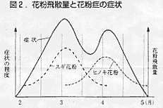節分の日のテレビで関東地方の今年のスギ花粉症は2月10日頃に始まり、花粉の飛散量は「やや多い」と予報されました。また「花粉情報協会」の予測でも東京都心での今年の花粉飛散量は4500個/cm2/季節と予想され平均(1800個位)の倍以上といわれています。 2000年の耳鼻科学会の全国調査では、スギ花粉症の有病率は16.2%(6人に1人)であり、東京都民は20.4%と多くまた、年代別では30・40代にピークがあります。スギは昭和50年代に大量に植林され現在450万haに達しますが花粉をつける年代になったこと、その小さい30〜40ミクロンの花粉が排気ガス中の窒素酸化化合物結合して鼻の粘膜や眼の結膜に作用して症状をおこします。 花粉症がおこるしくみ